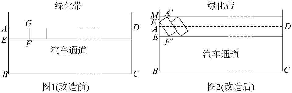 7、某校南门前有条长80米,宽8米的公路(如图矩形),公路的一侧划有16个长5米宽2.5米的停车位(如矩形),由于停车位不足,放学时段造成道路拥堵,学校提出一个改造方案,在不改变停车位的大小和汽车通道宽度的条件下,通过压缩道路边绿化带及改变停车位方向来增加停车位,记绿化带被压缩的宽度(米),停车位相对道路倾斜的角度 , 其中 , 则( )A、 B、 C、该路段改造后的停车位比改造前增加8个 D、该路段改造后的停车位比改造前增加9个
