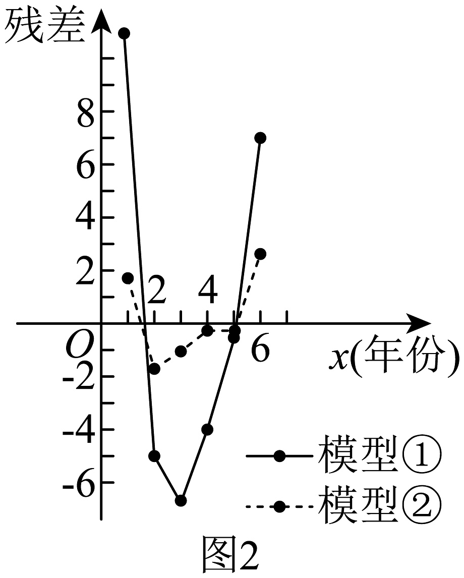 分别用两种模型:①;②进行拟合,得到相应的回归方程,并进行残差分析,得到如图所示的残差图(图2)(残差值真实值预测值).