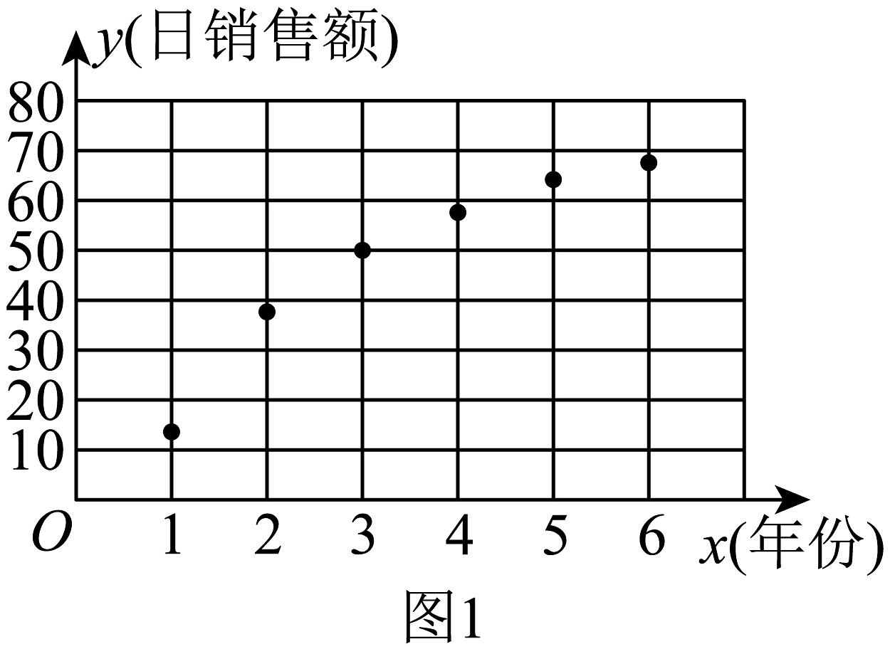 1、一年一度的“双11”促销活动落下帷幕,各大电商平台发布的数据显示,在消费品以旧换新、家电政府补贴等促消费政策和活动的带动下,消费市场潜能加速释放,带动相关商品销售保持增长. 经过调研,得到2019年到2024年“双11”活动当天某电商平台线上日销售额(单位: 百亿元)与年份(第年)的6组数据(时间变量的取值依次为),对数据进行处理,得到如下散点图(图1)及一些统计量的值. 其中.