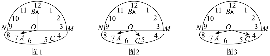 17、数学探究课上,小王从世界名画《记忆的永恒》中获得灵感,创作出了如图1所示的《垂直时光》.已知《垂直时光》是由两块半圆形钟组件和三根指针组成的,它如同一个标准的圆形钟沿着直径折成了直二面角(其中对应钟上数字对应钟上数字9).设的中点为 , 若长度为2的时针指向了钟上数字8,长度为3的分针指向了钟上数字12.现在小王准备安装长度为3的秒针(安装完秒针后,不考虑时针与分针可能产生的偏移,不考虑三根指针的粗细),则下列说法正确的是( )A、若秒针指向了钟上数字5,如图2,则 B、若秒针指向了钟上数字5,如图2,则平面 C、若秒针指向了钟上数字4,如图3,则与所成角的余弦值为 D、若秒针指向了钟上数字4,如图3,则四面体的外接球的表面积为