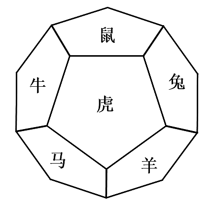 6、中国古代传统文化中,有记录人们出生年份的属相记录法,共有12种属相,分别是鼠、牛、虎、兔、龙、蛇、马、羊、猴、鸡、狗、猪,也称子、丑、寅、卯、辰、巳、午、未、申、酉、戌、亥.现有一个正十二面体,每一个(正五边形)面标有一个属相,如图.现将这个质地均匀的正十二面体先后抛掷两次,则朝上的面两次属相不同的概率是( )A、 B、 C、 D、