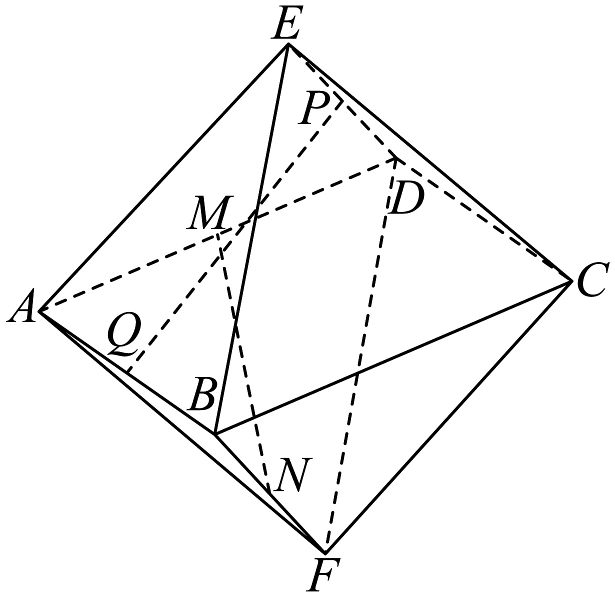 5、柏拉图多面体是因柏拉图及其追陮者对正多面体的研究而得名.如图是棱长均为的柏拉图多面体 , 点 , , , 分别为 , , , 的中点,则异面直线与所成角的余弦值为( )A、 B、 C、 D、