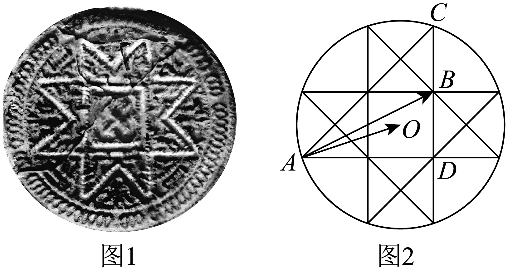 • 17、八角星纹是大汶口文化中期彩陶纹样中具有鲜明特色的花纹.八角星纹常绘于彩陶盆和豆的上腹,先于器外的上腹施一圈红色底衬,然后在上面绘并列的八角星形的单独纹样.八角星纹以白彩的成,黑线勾边,中为方形或圆形,且有向四面八方扩张的感觉.八角星纹延续的时间较长,传播范围亦广,在长江以南的时间稍晚的崧泽文化的陶豆座上也屡见刻有八角大汶口文化八角星纹.图2是图1抽象出来的图形,在图2中,圆中各个三角形(如△ACD)为等腰直角三角形,点O为圆心,中间部分是正方形且边长为2,定点A,B所在位置如图所示,则ABAO的值为(       )