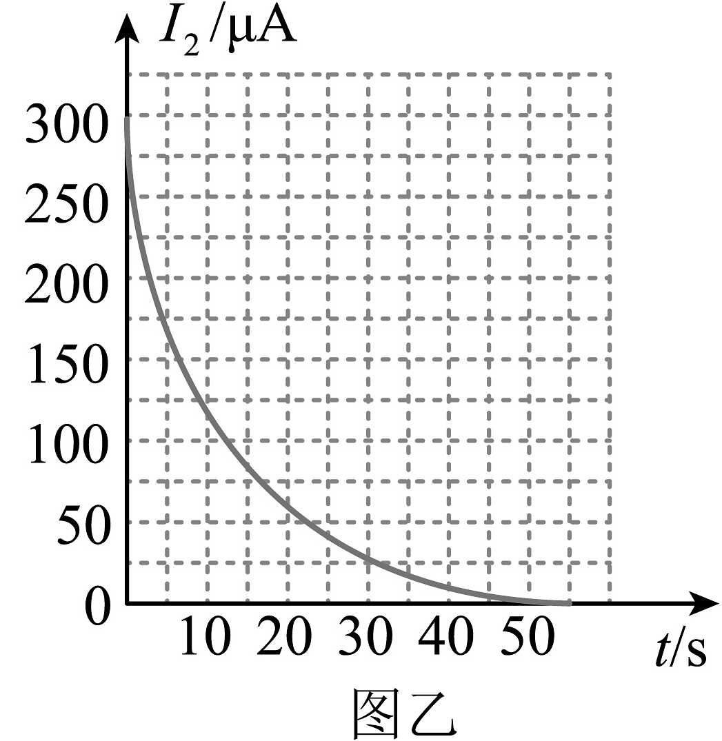(2)、充电稳定后,断开单刀双掷开关,用电压表接在电容器两端测量电压,发现读数缓慢减小,原因。(3)、某次让电源给电容器充电后,将开关S打向2,每间隔5s读取并记录一次电流表A2的示数I2 , 直到电流消失为止;以放电电流I2为纵轴,放电时间t为横轴,在坐标纸上作出I2-t图像如图乙所示。①图线与坐标轴围成的区域中,超过半格算一格,小于半格舍去,由此可知,电容器充电完成时储存的电荷量Q=C(结果保留三位有效数字)。
