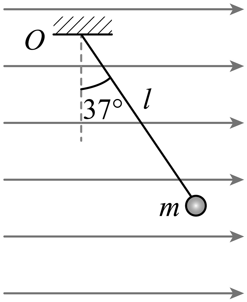 18、如图所示,长为l的绝缘细线一端固定在O点,另一端系一质量为m电荷量为q的小球。现将此装置放在水平向右的匀强电场中,小球处于静止状态,此时细线与竖直方向成37°。重力加速度为g, sin37 °= 0.60,cos37° = 0.80。(1)、判断小球的带电性质;(2)、求该匀强电场的电场强度E的大小;(3)、将小球向右拉起至与O点处于同一水平高度且细绳刚好张紧,静止释放,求: