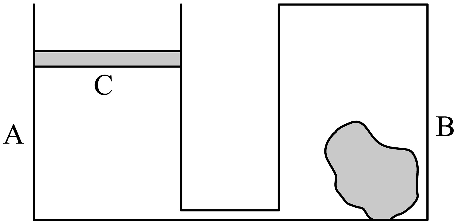 7、某学校实验小组设计了测量不规则矿石体积的气压体积测量仪。如图所示为气压体积测量仪的原理图,上端开口的气压筒A和上端封闭的测量筒B均为高 , 横截面积的导热气缸,两气缸连接处的细管体积不计。现把待测矿石置于测量筒B中,将质量的活塞从气压筒A上方开口处放下,在两气缸内封闭一定质量的理想气体(不计活塞厚度和摩擦力),缓慢降低封闭气体的温度至 , 活塞稳定后,活塞距气压筒A顶端。已知环境温度为27℃,外界大气压强为 , 重力加速度。