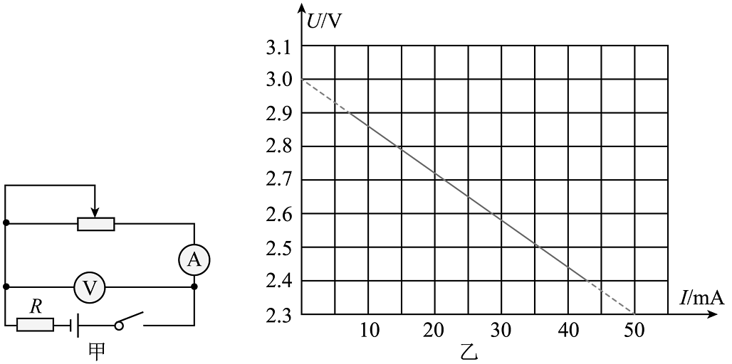 (1)、需要一个量程为0~3V的电压表,可用G1串联一个Ω的电阻改装而成;(2)、利用改装的电压表和电流表测电源的电动势和内阻,用图甲的电路图,滑动变阻器应选用(填“R1”或“R2”),得到多组数据,绘出图乙中的U-I图像,则电源电动势为V,内阻为Ω(结果保留两位有效数字)。(3)、将两个相同的非线性元件接入电路图丙,图丁是该非线性元件的电压和电流关系,则该电源的效率是%(结果保留一位小数)。 -