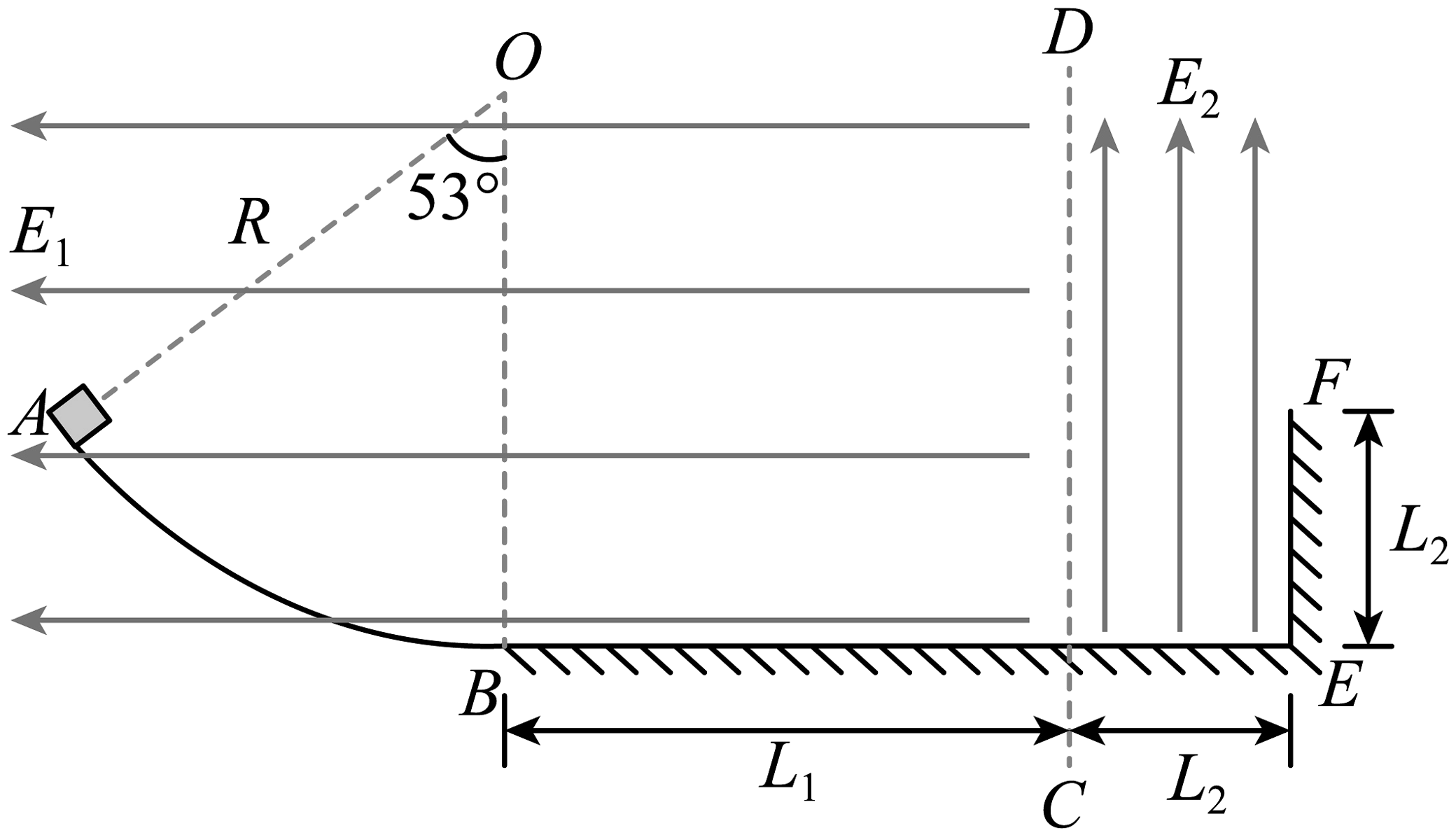 16、如图光滑圆弧轨道AB的圆心为O,半径R=2.5m,圆弧轨道AB的B点与水平地面BE相切,B点在O点的正下方,在B点的右侧有一竖直虚线CD,B点到竖直虚线CD的距离为L1=2.5m,竖直虚线CD的左侧有E1=25N/C、水平向左的匀强电场,竖直虚线CD的右侧有E2(大小未知)、竖直向上的匀强电场。竖直虚线CD的右侧有一竖直墙壁EF,墙壁EF到竖直虚线CD的距离为L2=1m,墙壁EF底端E点与水平地面BE相连接,EF的高度也为L2=1m。现将一电荷量为、质量为m=1kg的绝缘滑块(视为质点)从A点由静止释放沿圆弧轨道AB下滑,最后进入虚线CD右侧。水平地面BE与滑块间动摩擦因数 , , , 。求: