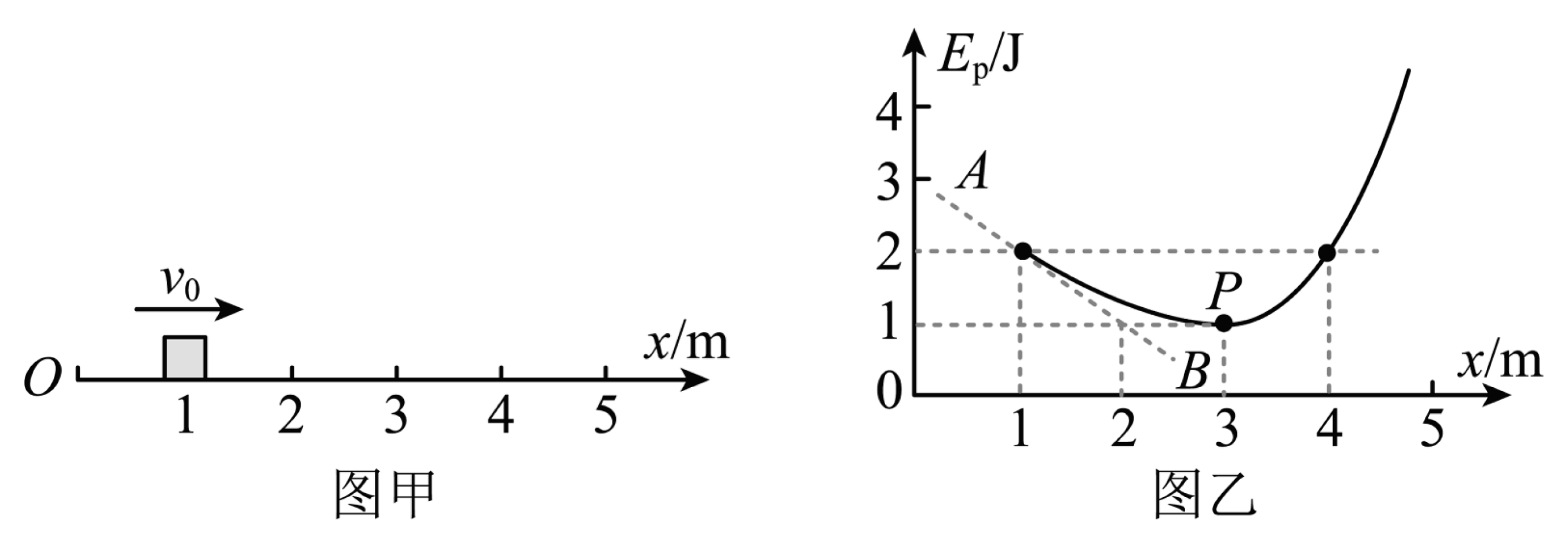 8、如图甲所示,在粗糙绝缘的水平地面上,一质量m = 2kg的带负电小滑块(可视为质点)在x = 1m处以初速度v0 = 2m/s沿x轴正方向运动,滑块与地面间的动摩擦因数为0.04。整个区域存在沿水平方向的电场(图中未画出),滑块在不同位置所具有的电势能Ep如图乙所示,P点是图线最低点,虚线AB是经过x = 1m处的切线,并且AB经过(0,3)和(3,0)两点,重力加速度取g = 10m/s2 , 则下列说法正确的是( )A、x = 3m处的电势最高 B、滑块运动至x = 2m处时,速度可能最大 C、向右运动过程中,电场力先做负功后做正功 D、滑块向右一定不能经过x = 4m处的位置