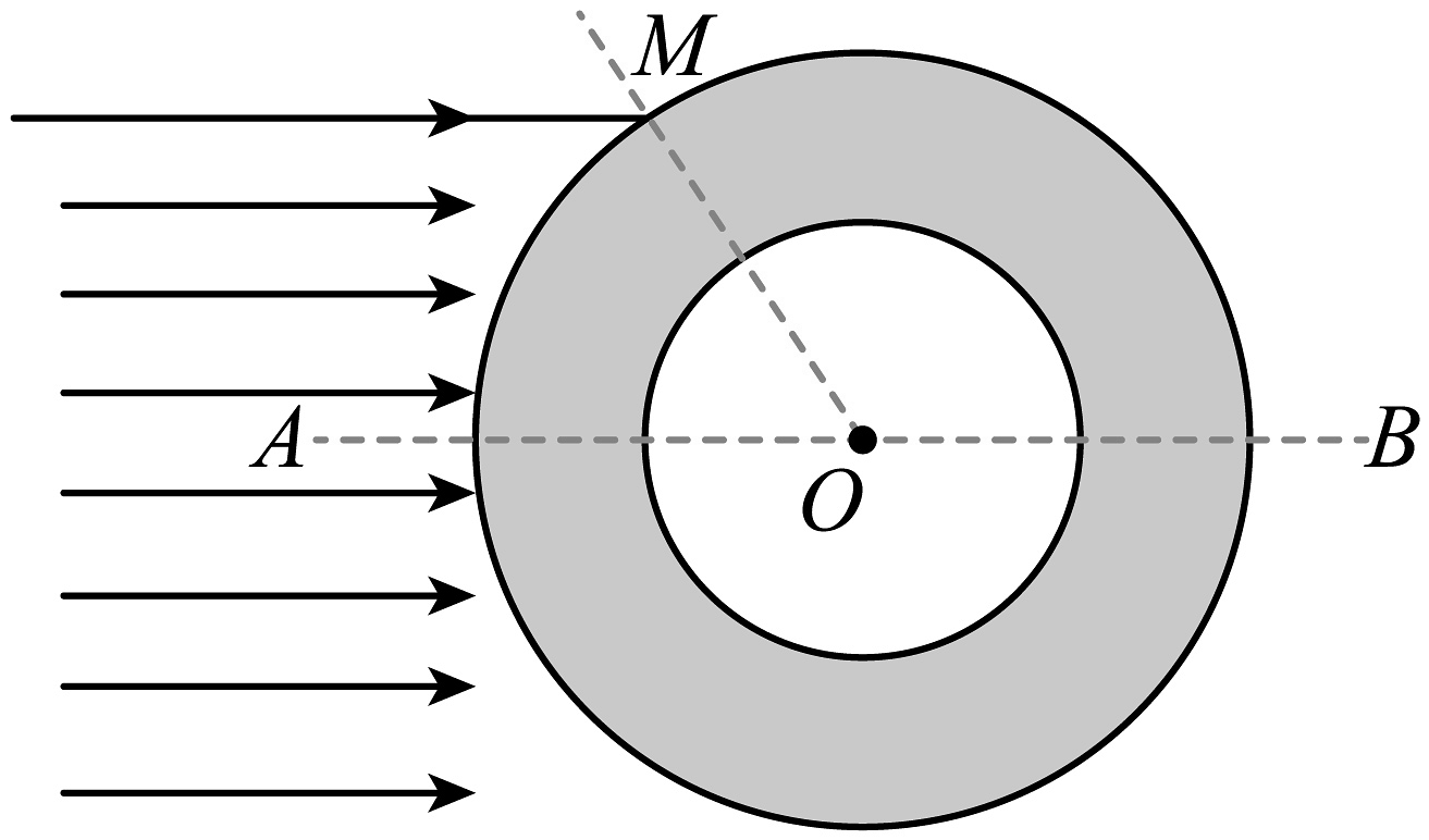 17、2021年12月9日,“太空教师”翟志刚、王亚平、叶兆富在中国空间站为青少年带来了一场精彩纷呈的太空科普课。王亚平在水膜里注水,得到了一个晶莹剔透的水球,接着又在水球中央注入一个气池,形成了两个同心的球。如图所示AB是通过球心O的一条直线,有一束宽为8R的单色光沿着水球的水平轴纹射向水球左侧表面,光的中轴线与AB重合,内球面半径为3R,外球面半径为5R,边界光线经折射后恰好与内表面相切,已知sin37°=0.6,求:
