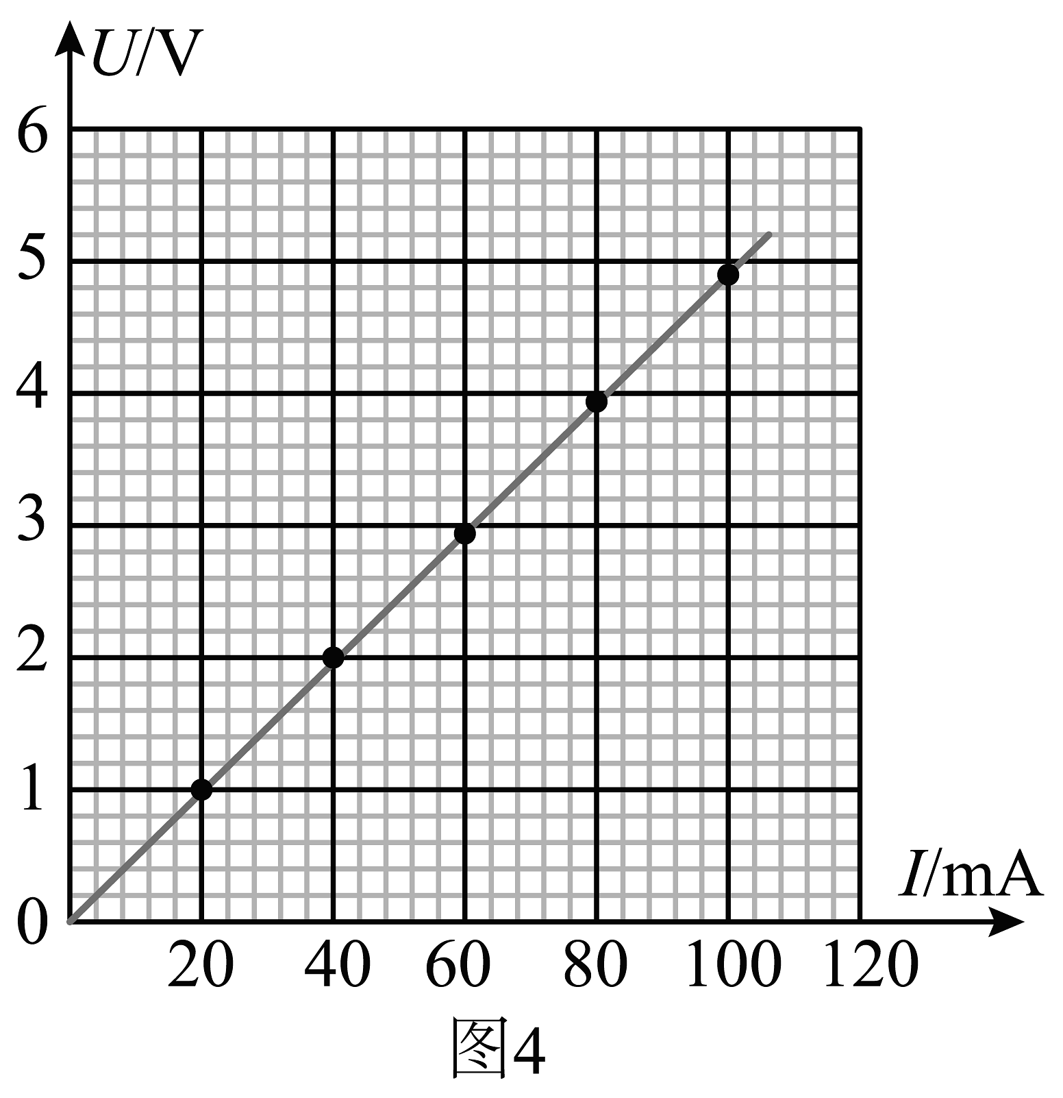 (3)为测量Rx , 该同学利用图2所示的电路,调节滑动变阻器测得5组电压U1和电流I1的值,作出的U1-I1关系图像如图4所示。接着将电压表改接在a、b两端,测得5组电压U2和电流I2的值,数据见下表:
