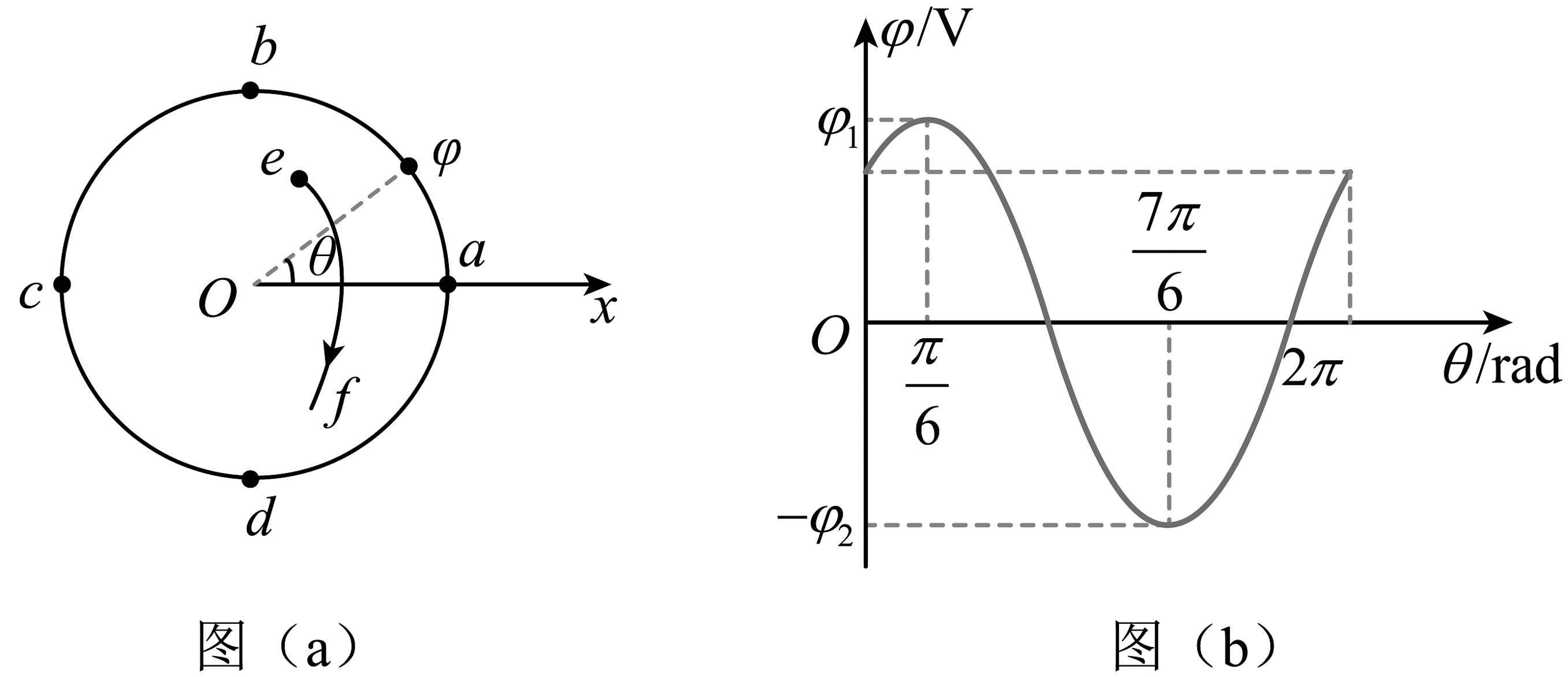 17、纸面内存在沿某方向的匀强电场,在电场中取O点为坐标原点建立x轴,以O点为圆心、以R为半径作圆,从x轴上的a点开始沿逆时针方向将圆四等分,a、b、c、d是圆周上的4个等分点,实线ef为一带电粒子在电场中从e点运动到f点的运动轨迹,如图(a)所示;测量出圆上各点的电势、半径同x轴正方向的夹角θ,描绘出一θ图像如图(b)所示,下列说法正确的是( )A、粒子带负电 B、粒子从e点运动到f点的过程中电势能逐渐增大 C、O点的电势为 D、电场强度的大小为