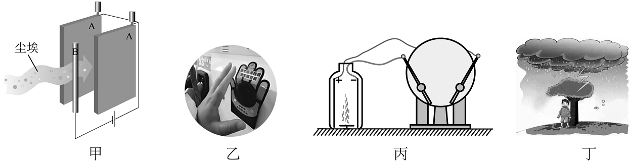 4、关于以下场景的说法错误的是( )A、图甲为静电除尘原理的示意图,带负电的尘埃将被吸附到带正电的板状收集器A上 B、如图乙所示,给汽车加油前要触摸一下静电释放器,是为了导走人身上的静电 C、图丙中摇动起电机,烟雾缭绕的塑料瓶顿时清澈透明,其工作原理为静电吸附 D、如图丁所示,我们在户外遇到雷暴天气,可以停留在山顶或高大的树下躲避