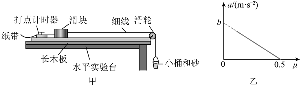 20、图甲为“探究加速度与力、质量的关系”的实验装置。某同学欲用这套实验装置探究滑块的加速度与长木板和滑块间的动摩擦因数的关系,在其他条件不变的情况下,通过多次改变动摩擦因数的值,利用纸带测量结果计算对应的多个加速度的值,画出了图像,如图乙所示,取重力加速度大小。(1)、为尽可能准确地完成实验,下列做法正确的是________。A、实验中不必保证桶和砂子的总质量远小于滑块的质量 B、滑块的质量可以改变 C、桶和砂子的总质量可以改变 D、连接滑块的细线与长木板可以不平行(2)、由图乙可知,若滑块的质量 , 则小桶和砂子的总质量。(3)、在第(2)问条件下,理论上,图乙中。(保留两位有效数字)