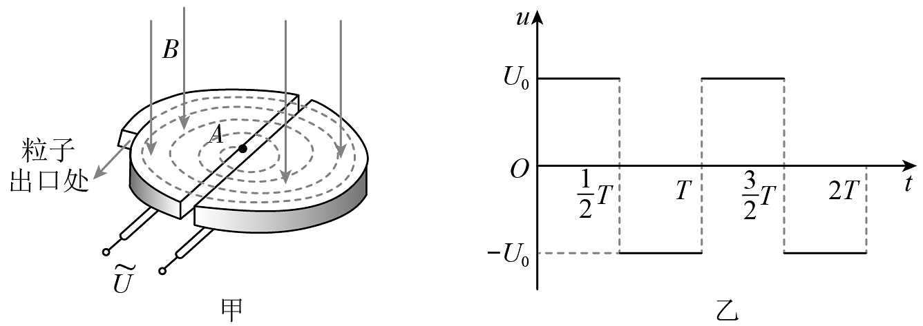 3、劳伦斯发明了回旋加速器,被加速的粒子在一圆形结构里运动,其运动轨迹由磁场控制,通过交变电场给带电粒子加速。图甲是回旋加速器的示意图,粒子出口处如图甲所示。图乙是回旋加速器所用的交变电压随时间的变化规律。某物理学习小组在学习了回旋加速器原理之后,想利用同一回旋加速器分别加速两种带正电的粒子,所带电荷量分别为、 , 质量分别为、。保持交变电压随时间变化的规律不变,需要调整所加磁场的磁感应强度大小,则下列说法错误的是( )A、所加磁场的磁感应强度大小之比为 B、粒子获得的最大动能之比为 C、粒子的加速次数之比为 D、粒子在回旋加速器中的转动时间之比为