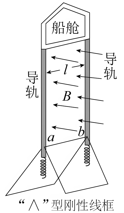 3、2020年12月1日23时11分,嫦娥五号探测器成功着陆在月球正面西经51.8度、北纬43.1度附近的预选着陆区。小明同学在感到骄傲和自豪的同时,考虑到月球上没有空气,无法通过降落伞减速降落,于是设计了一种新型着陆装置。如图,该导装置由船舱、间距为l的平行导轨、产生垂直船舱导轨平面的磁感应强度大小为B的匀强磁场的磁体和质量为m的“∧”形刚性线框组成,“∧”形刚性线框ab边可沿导轨滑动并接触良好。总质量为m2的船舱、导轨和磁体固定在一起。已知,整个装置着陆瞬间的速度为v0 , 着陆后“∧”形线框速度立刻变为0,已知船舱电阻为6r,“∧”形线框的每条边的边长均为l,电阻均为r,月球表面的重力加速度为 , 整个过程中只有ab边在磁场中,线框与月球表面绝缘,不计导轨电阻和摩擦阻力,则( )A、着陆后,在船舱下降的过程中感应电流从a点流向b点 B、着陆后,在船舱下降的过程中a点的电势高于b点的电势 C、若在导轨下方缓冲弹簧接触月球表面前船舱已匀速,则船舱匀速的速度大小为 D、若在导轨下方缓冲弹簧接触月球表面前船舱已匀速,则从着陆开始到船舱匀速瞬间经过ab边的电荷量为