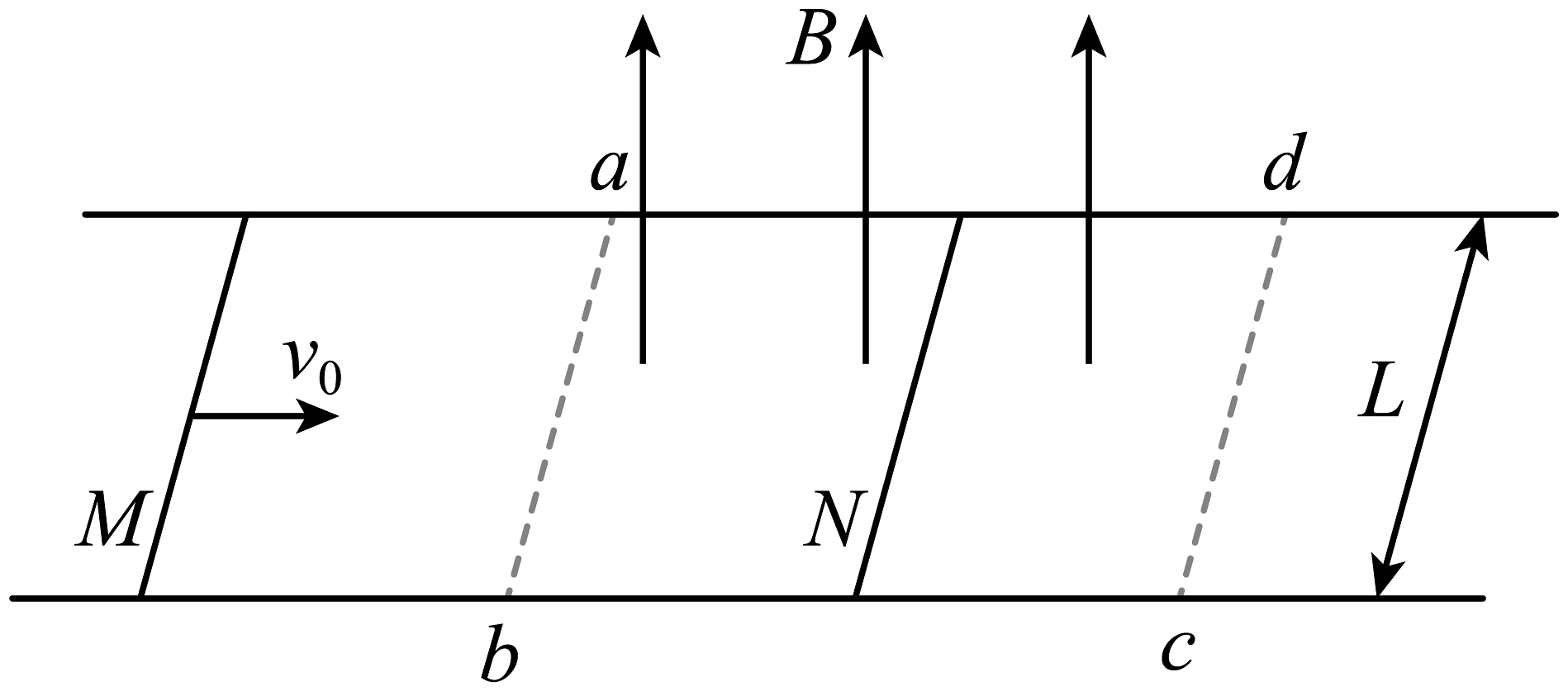 1、如图所示,两平行光滑长直金属导轨水平放置,间距为L。abcd区域有匀强磁场,磁感应强度大小为B,方向竖直向上。初始时刻,磁场外的细金属杆M以初速度v0向右运动,磁场内的细金属杆N处于静止状态。两金属杆与导轨接触良好且运动过程中始终与导轨垂直。两杆的质量均为m,在导轨间的电阻均为R,感应电流产生的磁场及导轨的电阻忽略不计。