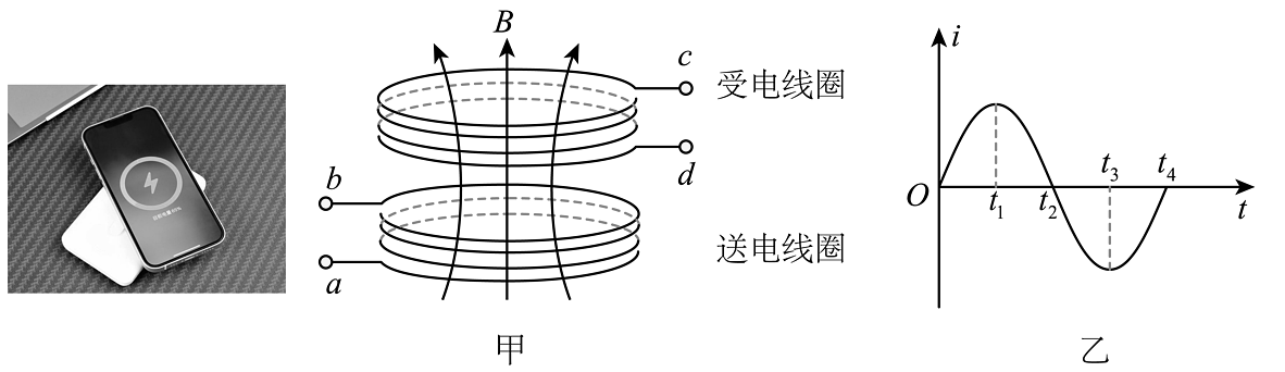 6、手机无线充电是比较新颖的充电方式。如图所示,电磁感应式无线充电的原理与变压器类似,通过分别安装在充电基座和接收能量装置上的线圈,利用产生的磁场传递能量。当充电基座上的送电线圈通入正弦式交变电流后,就会在邻近的受电线圈中感应出电流,最终实现为手机电池充电。当充电板内的送电线圈通入如图乙所示的交变电流时(电流由a流入时的方向为正),不考虑感应线圈的自感,下列说法中正确的是( )A、t1~t3时间内,c点电势始终高于d点电势 B、t1~t3时间内,c点电势始终低于d点电势 C、t1在时刻受电线圈中电流最强 D、t2时刻受电线圈中电流为0