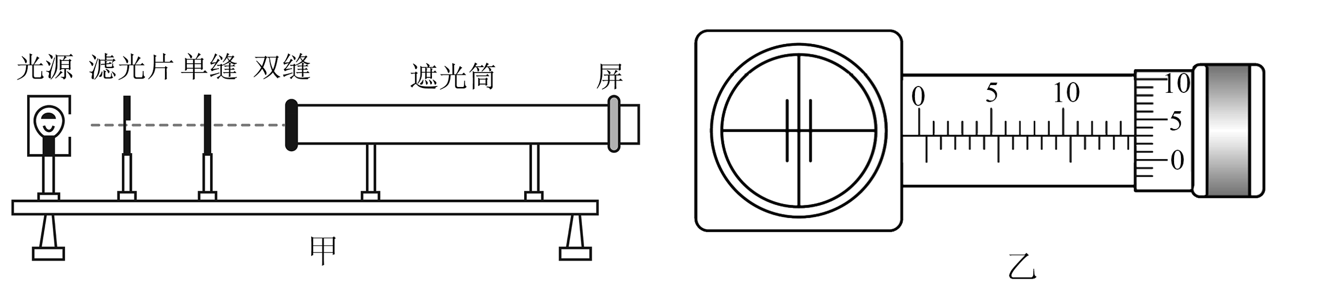 2、如图甲所示,为“用双缝干涉测量光的波长”的实验装置。(1)、实验前,应调节光具座上放置的各光学元件,并使各元件的中心位于遮光筒的轴线上,保证单缝和双缝平行。若从目镜中看到干涉条纹太密,要想减少从目镜中观察到的条纹数量,下列做法可行的是 。A、仅换用间距更大的双缝 B、仅将单缝向双缝靠近 C、仅将屏向靠近双缝的方向移动 D、仅将紫色滤光片换成红色滤光片(2)、转动测量头的手轮,使分划板中心刻线对准第1条亮纹,读出手轮的读数为1.030mm。继续转动手轮,使分划板中心刻线对准第10条亮纹如图乙所示,读出手轮的读数为mm。已知双缝间的宽度d=0.3mm,通过激光测距仪测量出双缝到投影屏间的距离L=1.0m,则该种色光的波长是m。