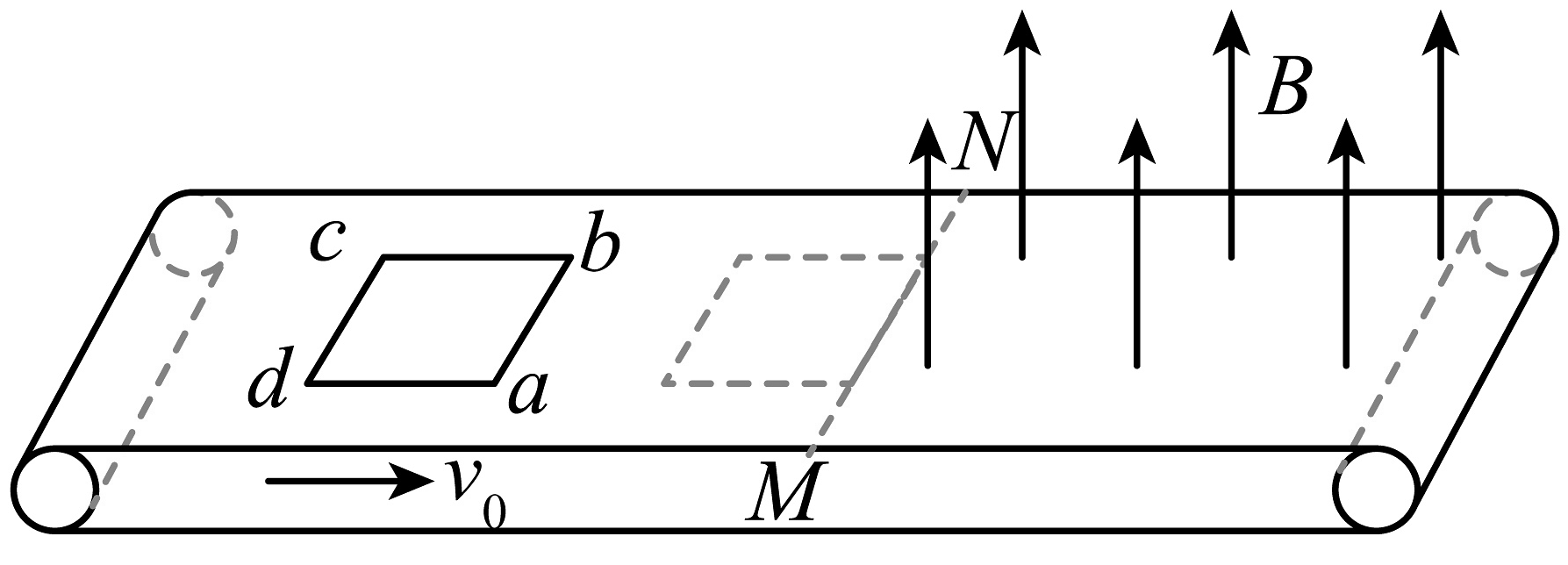 4、如图所示,一足够长水平传送带顺时针转动,速度大小恒为。传送带上MN右侧存在一方向竖直向上的匀强磁场区域,磁感应强度大小为。有一边长为、粗细均匀的正方形导线框abcd,质量 , 总电阻。ab边与磁场边界平行,在ab边距离MN为的位置由静止释放该线框,已知线框与传送带之间的动摩擦因数为 , 线框刚到MN直至完全进入磁场用时, , 重力加速度g取 , 求: