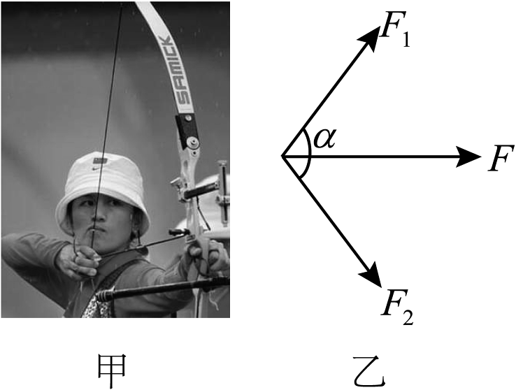 15、如图甲所示,射箭时,释放箭的瞬间若弓弦的拉力为100N,对箭产生的作用力为120N,其弓弦的拉力如图乙中F1和F2所示,对箭产生的作用力如图中F所示,则弓弦的夹角应为()( )A、53° B、127° C、143° D、106°