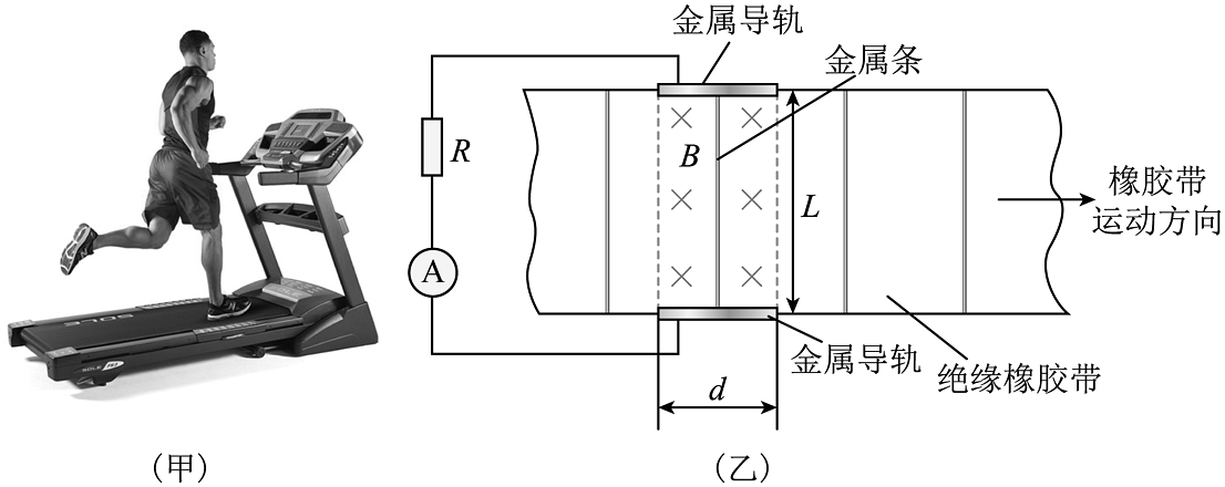 5、图(甲)所示为某种可测速的跑步机,其测速原理如图(乙)所示。该机底面固定着两根间距、长度的平行金属导轨。两金属导轨间充满磁感应强度为0.5T、方向垂直于纸面向里的匀强磁场,两金属导轨通过导线与的定值电阻及理想电流表相连。跑步机的橡胶带上镀有平行细金属条,橡胶带运动时,磁场中始终只有一根金属条与两金属导轨接通,已知每根金属条的电阻为 , 橡胶带以2m/s匀速运动,求:
