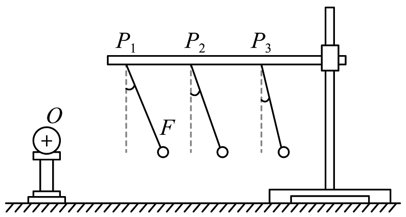O是一个带正电的物体,把系在丝线上的带正电的小球先后挂在图中P1、P2、P3等位置,比较小球在不同位置所受带电体的作用力的大小。使小球处于同一位置,增大(或减小)小球所带的电荷量,比较小球所受的静电力的大小。