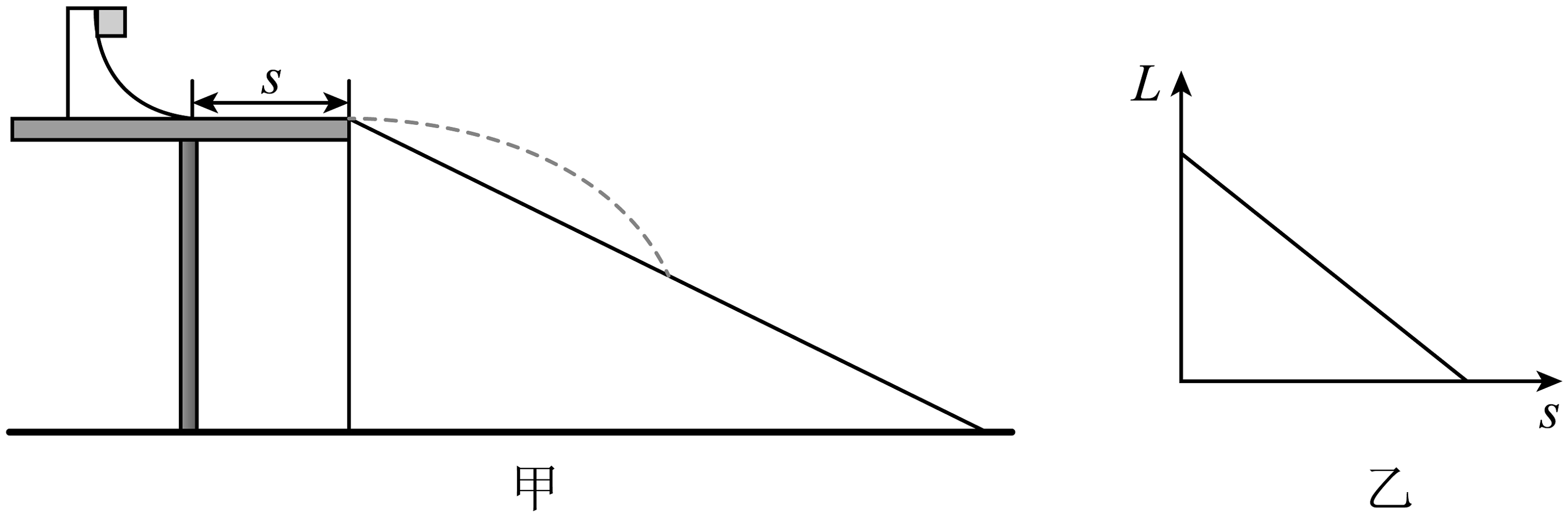 2、某同学利用如图甲所示的装置完成了动摩擦因数的测量,一斜面体的顶端与桌面等高,并紧靠在一起,弧形槽固定在桌面上,槽的底端与桌面相切,物体由弧形槽的最高点无初速释放,在桌面上滑行一段距离后离开桌面,经过一段时间落在斜面体上,测量出弧形槽的底端到桌面边缘的距离s,物体在斜面体上的落地点到桌面边缘的距离为L。改变弧形槽的固定点,物体仍由弧形槽的最高点无初速释放,重复操作,得出多组s、L的实验数据,利用得到的数据描画出如图乙所示的图像。(1)、物体每次由弧形槽的最高点无初速释放,这样做的目的是。(2)、为了完成实验,还应测量的物理量有______。A、物体的质量 B、斜面体的倾角 C、弧形槽的半径 D、释放点到桌面的高度(3)、根据数据得到的图像如图乙所示,已知图线斜率的绝对值为 , 则动摩擦因数为。(用已知量和需要测量的物理量表示)