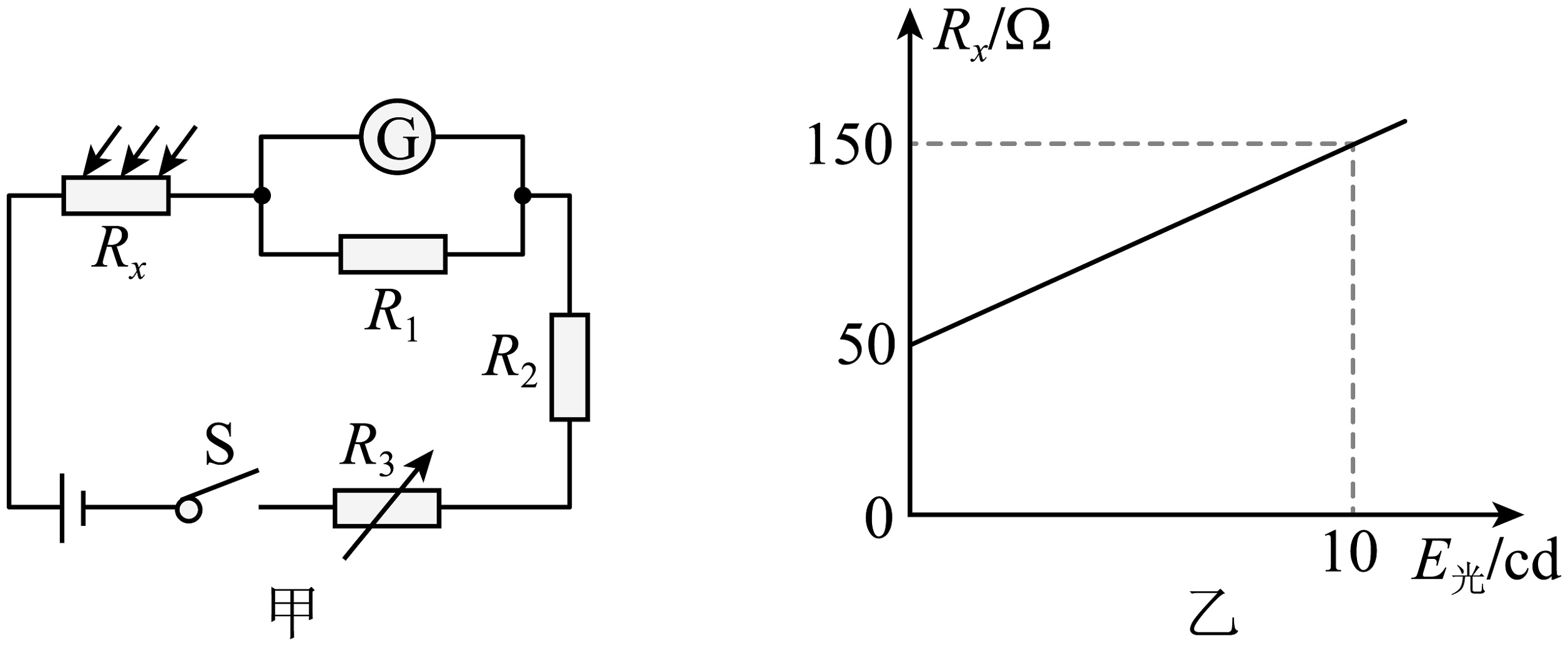 1、某同学利用如图甲所示的电路完成了对光敏电阻特性的研究,电路中表头的量程为、内阻为 , 为了完成实验需将表头改装成量程为的电流表,电路中为保护电阻,可调电阻的最大电阻值为 , 电源的电动势为 , 内阻可忽略不计.实验时得出光敏电阻与光强的关系图像,如图乙所示.(1)、电路中,定值电阻的阻值为 .(2)、下列可供选择的保护电阻,最合适的为______.A、 B、 C、 D、(3)、选取合适的电阻后,当光的强度为零时,可调电阻的阻值应调为;保持的阻值不变,在表头示数为处对应的光的强度分别为、 , 在表头上的电流刻度处标出对应的光的强度。