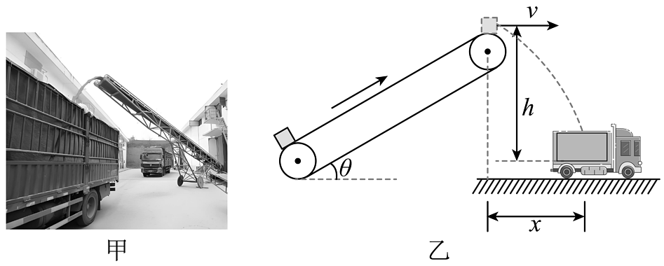 8、图甲所示为粮库进行粮食转运时的常见情境,粮食通过倾斜传送带直接从高处飞落到卡车中,实现高效率装车。该过程可简化成图乙所示物理情境,图中用物块表示粮食颗粒,不考虑在传送带上和空中运动时粮食颗粒间的相互作用及空气阻力。已知传送带底端到顶端的距离 , 与水平面间的夹角 , 粮食颗粒与传送带间的动摩擦因数 , 传送带顺时针转动的速率 , 其顶部与车厢底部的高度差粮食从底端进入传送带时速度为零,从顶端离开传送带后做平抛运动,每秒钟可均匀传送质量为10kg的粮食,粮食落到车厢后速度立即变为零,重力加速度。(1)、求表示粮食颗粒的物块从进入传送带至落到车厢底部需要多少时间?(2)、若忽略车厢内粮食的上升,求装车过程中粮食对车厢底部的冲击力大小。