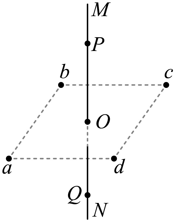 15、如图所示,四个电荷量大小相等的点电荷固定在水平面内正方形的四个顶点上,其中a、c带正电,b、d带负电。竖直线MN经过正方形的中心O点,MN上的P、Q两点关于O点对称,取无限远处电势为零。下列说法正确的是( )A、O点的电场强度不为零 B、P、Q两点的电场强度均为零 C、P、Q两点的电势不相等 D、P点的电势大于零