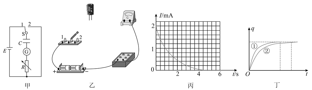 13、某同学用图甲所示电路观察电容器的充、放电现象。现提供如下实验器材:电源电容器电阻箱毫安表单刀双掷开关和导线若干。(1)、根据图甲电路在图乙中用笔画线代替导线将实物电路连接完整。(2)、用电流传感器替换毫安表,测出电路中的电流随时间变化的图像如丙图所示,电源输出电压为 , 则电容器的电容约为。(保留2位有效数字)(3)、现通过改变电路某一元件的参数对同一电容器进行两次充电,得到图像如丁中①②所示,下列说法正确的是________。A、曲线①对应电路中电阻箱的阻值较大 B、曲线②对应电路中电阻箱的阻值较大 C、曲线①对应电路中电源输出电压较小 D、曲线②对应电路中电源输出电压较小