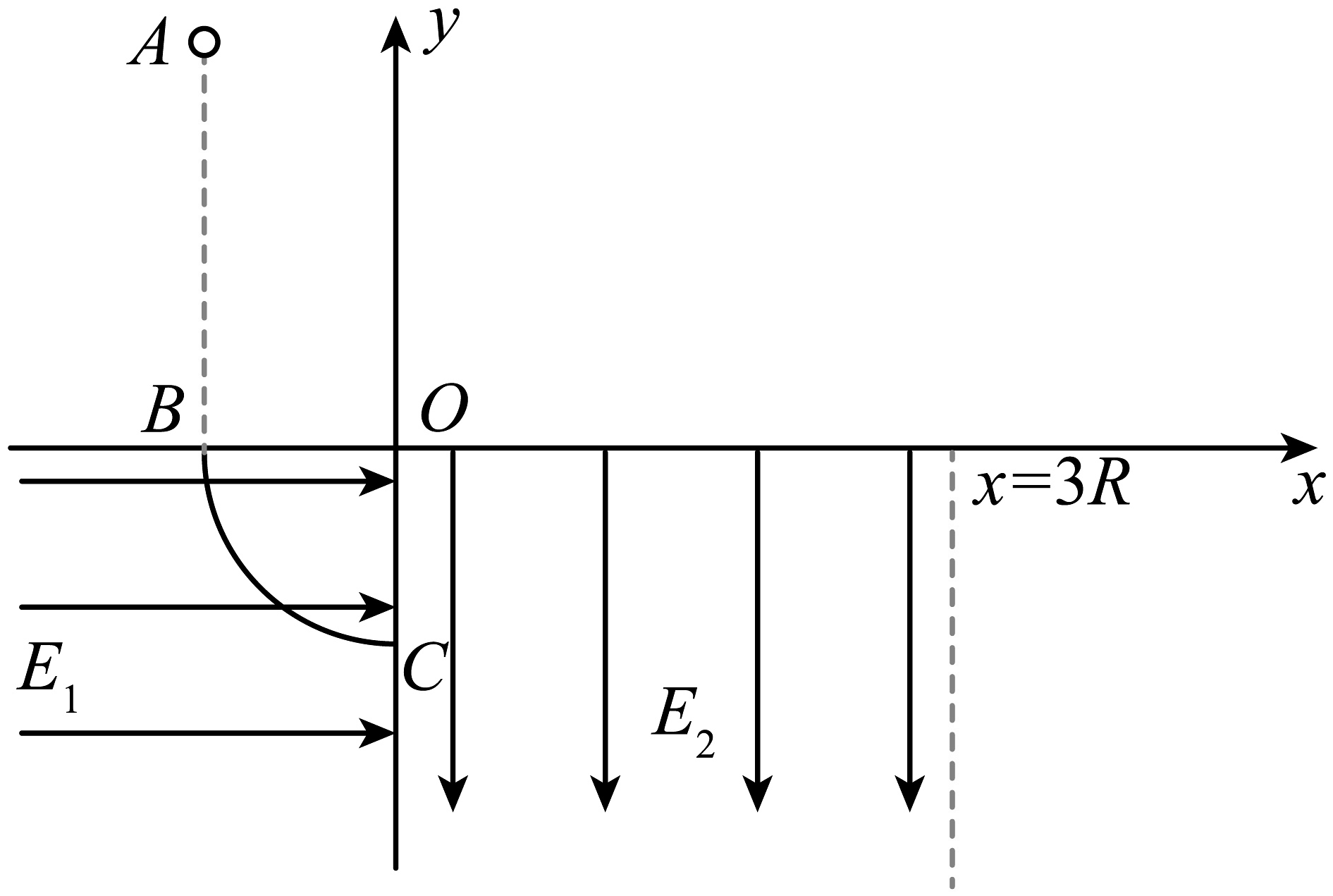 11、如图所示,竖直平面直角坐标系 , 第Ⅲ象限内固定有半径为的四分之一光滑绝缘圆弧轨道BC,轨道的圆心在坐标原点O,B端在轴上,C端在轴上,同时存在大小为 , 方向水平向右的匀强电场。第Ⅳ象限与之间有大小为 , 方向竖直向下的匀强电场。现将一质量为 , 电荷量为的带负电小球从B点正上方高处的A点由静止释放,并从B点进入圆弧轨道,重力加速度用表示,求:(1)、小球经过C点时的速度大小;(2)、小球在第Ⅲ象限受到轨道支持力的最大值;(3)、小球运动到轴右侧后与轴的交点坐标。