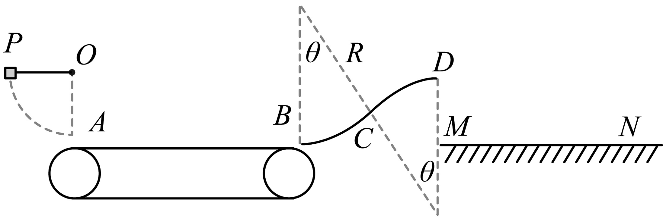 10、如图所示,一不可伸长的细线长为 , 一端固定于点,另一端连接质量为的滑块。滑块在点正下方时,恰好位于水平传送带的左端点。传送带右端点连接两段光滑圆弧轨道两点切线水平,两段圆弧半径均为 , 圆心角均为 , 传送带与圆弧平滑连接。水平面与等高,点位于点正下方,滑块运动过程中可视为质点。现将滑块拉至点(等高且)静止释放,细绳恰好在点断裂,滑块滑上水平传送带,传送带长为。若传送带静止,滑块恰好可以滑到点,重力加速度 , 求:(1)、细线能承受的最大拉力;(2)、滑块与传送带间的动摩擦因数;(3)、若传送带顺时针转动,滑块能沿圆弧轨道运动并从点水平抛出,求落点到点的距离与传送带速度之间的关系。