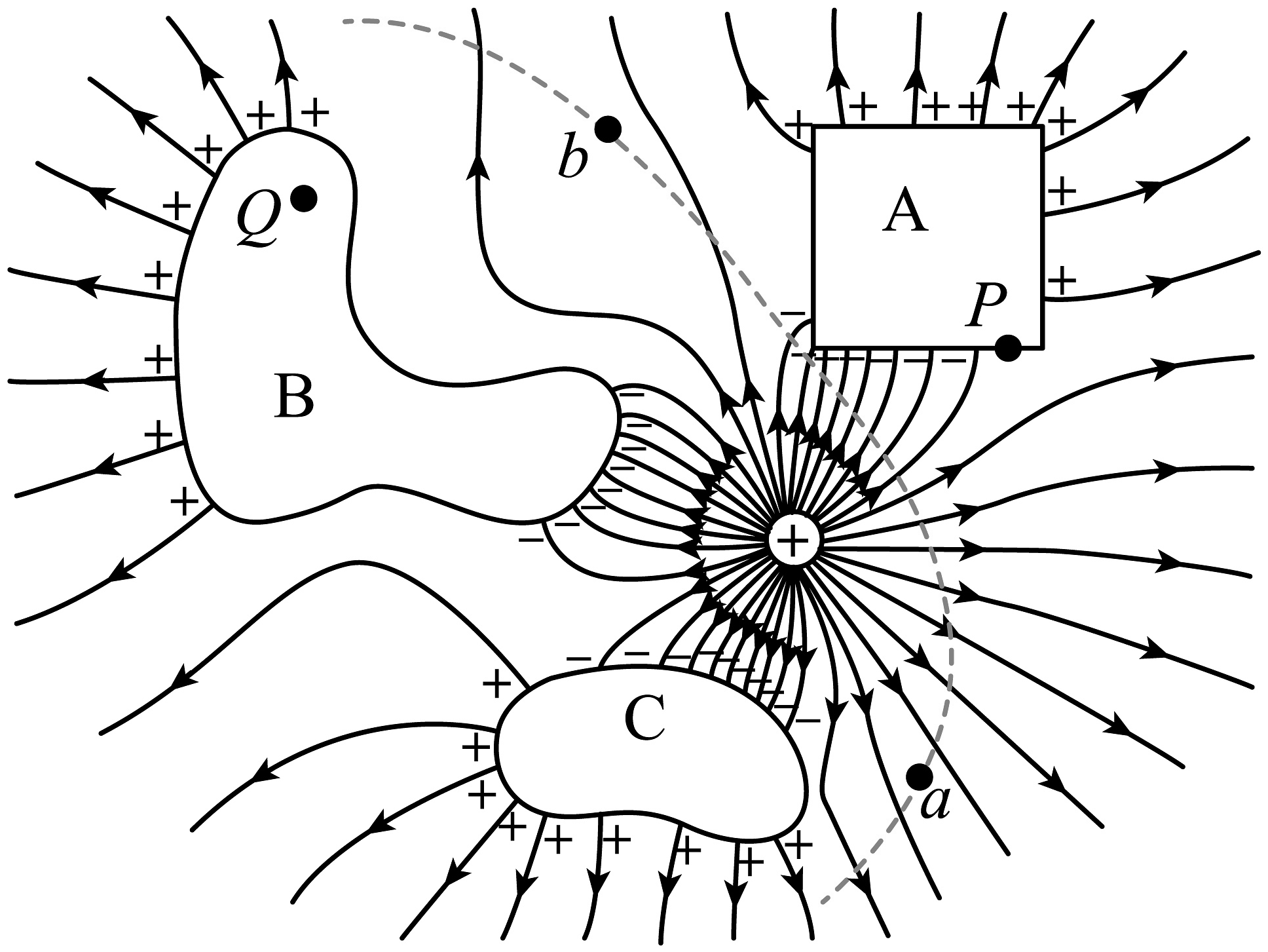 1、一个正电荷周围有3种形状各异的金属导电体。在电荷周围形成如图所示的电场分布,为导体表面上的点,为导体内距离为的点,图中虚线为一电荷只在电场作用下的运动轨迹,为运动轨迹上的两点,则( )A、运动电荷带正电 B、运动电荷在点加速度比大 C、电场在点的方向斜向右上方 D、导体B上的感应电荷在点形成的场强大小为