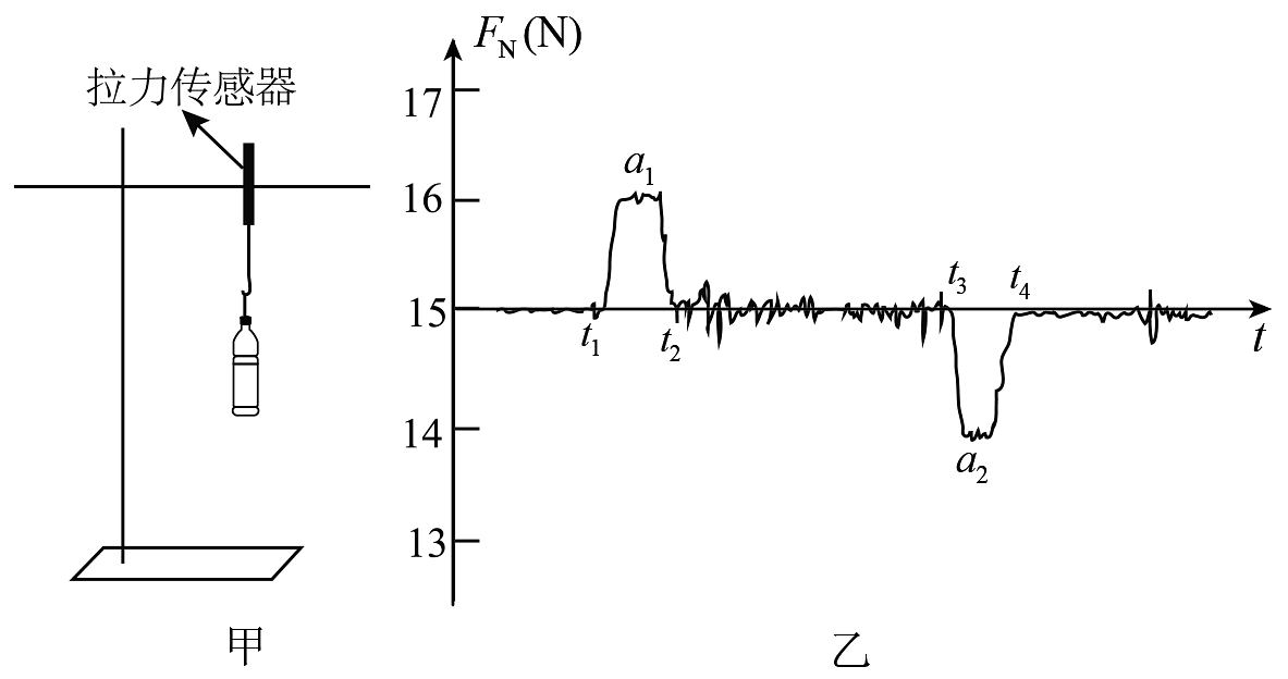 4、如图所示,图甲电梯内铁架台上的拉力传感器下挂有一瓶矿泉水,图乙是电梯启动后电脑采集到的拉力随时间的变化情况,重力加速度 , 下列说法正确的是( )A、图乙中,反映了电梯从高层到低层运动 B、不能从图乙中得到矿泉水的重力 C、根据图乙可以求出电梯启动过程中,匀加速阶段的加速度大小约为 D、因为不知道电梯启动方向,所以无法判断哪段时间矿泉水瓶处于超重状态