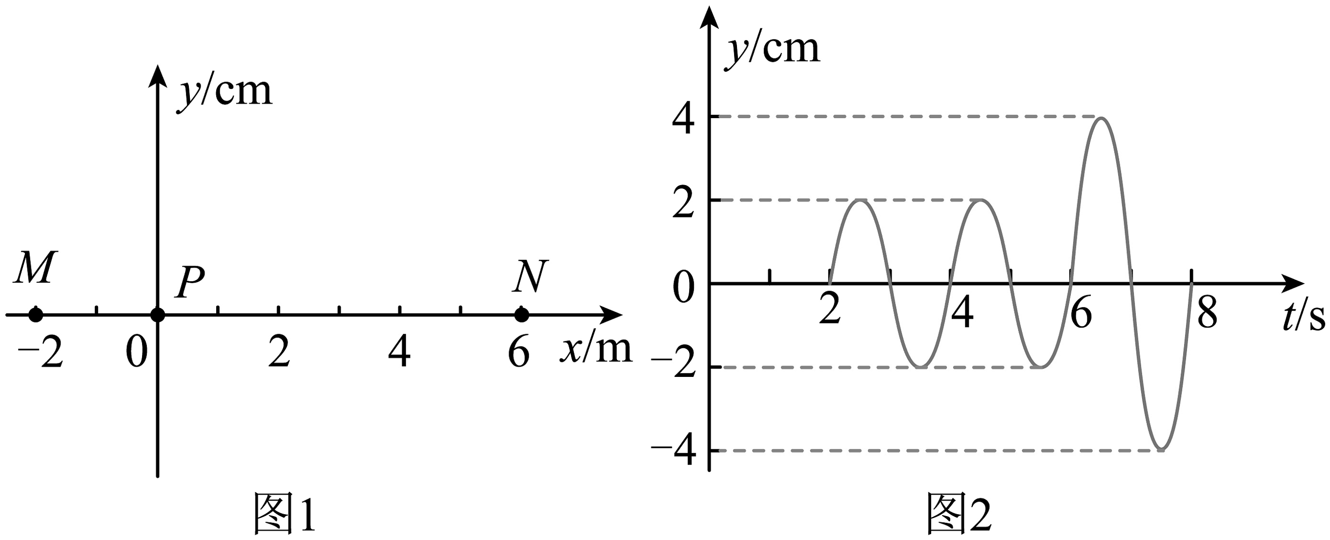 5、如图1所示,在均匀介质中两波源M、N分别位于处,质点P位于坐标原点,时刻,两波源同时振动。图2为质点P的振动图像。则( )A、M、N的起振方向相反 B、波的传播速度为 C、较长时间后,间有7个振动减弱点 D、内质点P经过的路程为