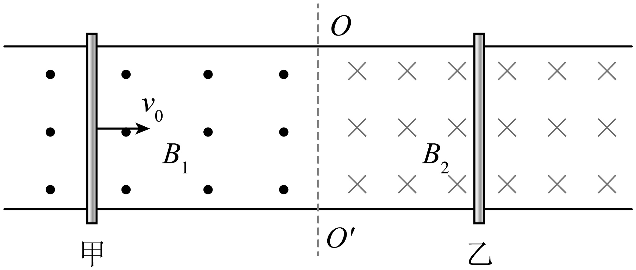 2、一水平足够长的平行轨道如图所示,以为界左边磁场的磁感应强度大小为 , 方向垂直纸面向外,右边磁场的磁感应强度大小为 , 方向垂直纸面向里。导体棒甲、乙的质量均为m,电阻相同,开始时均处于静止状态。现给甲一水平向右的初速度 , 若轨道光滑且电阻不计,甲、乙始终在各自磁场中运动,下列说法中正确的是( )A、乙将向右运动 B、甲、乙运动过程中动量不守恒 C、稳定后,甲的速度为 D、当乙的速度为 , 乙棒产生的焦耳热为