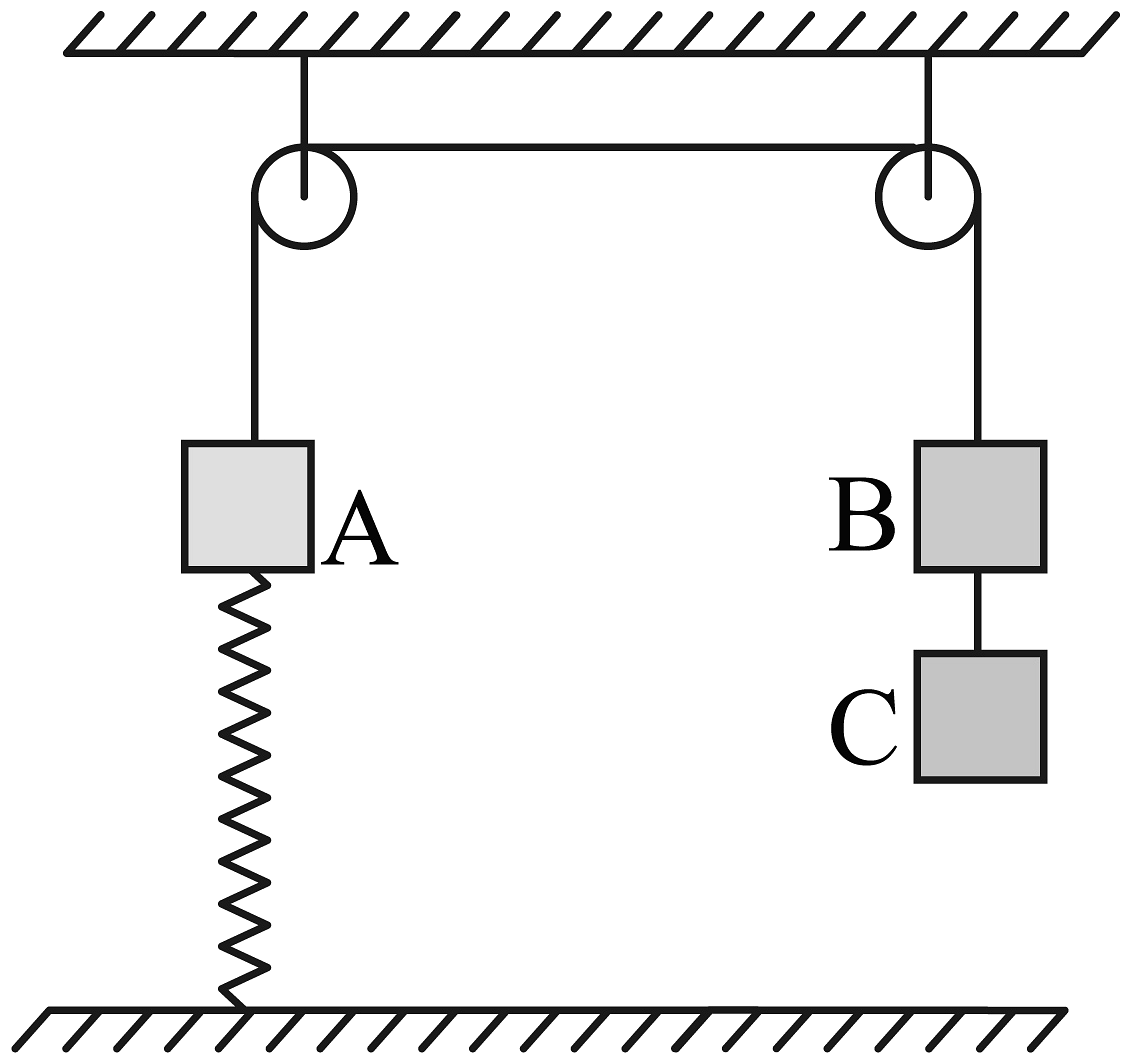 6、如图所示,A、B、C三个物体的质量分别为2m、2m、3m,其中物体B和C通过轻绳连在一起,物体A和B通过跨过光滑定滑轮的轻绳连在一起,物体A与轻弹簧上端连在一起,轻弹箒下端固定在地面上,初始时三个物体均保持静止(重力加速度为g).下列说法正确的是( )A、初始时弹簧处于压缩状态 B、剪断A、B间轻绳后瞬间物体B、C间轻绳拉力为3mg C、剪断B、C间轻绳后瞬间物体A的加速度为 D、剪断B、C间轻绳后瞬间物体A、B间轻绳拉力为