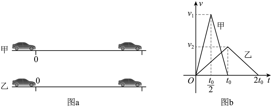 17、在某次新能源汽车直线运动性能检测实验中,在两条平行的平直公路上,甲和乙两车头平齐,同时由静止开始沿平直公路做匀加速直线运动,然后刹车做匀减速直线运动直至停止,停止后车头仍平齐,如图a所示,两车的图像如图b所示,下列说法正确的是( )A、甲、乙两车最大速度之比为 B、甲、乙两车加速度大小之比为 C、甲车达到最大速度后,再经过时间两车速度相等 D、甲车运动了时,两车相距最远