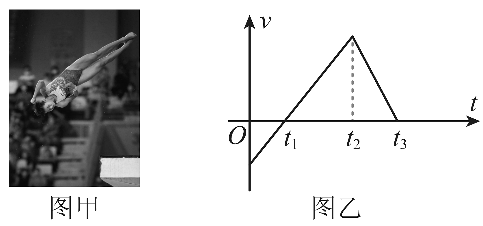 2、在2024年巴黎奥运会上,十七岁的中国名将全红婵卫冕巴黎奥运会女子10米跳台冠军(如图甲所示),图乙为其竖直分速度与时间的关系图象,以其向上离开跳台时作为计时起点,运动过程中视其为质点,则下列说法正确的是( )A、时刻达到最高点 B、时刻开始进入水面 C、时间段加速度竖直向下 D、时间段与时间段加速度方向相反