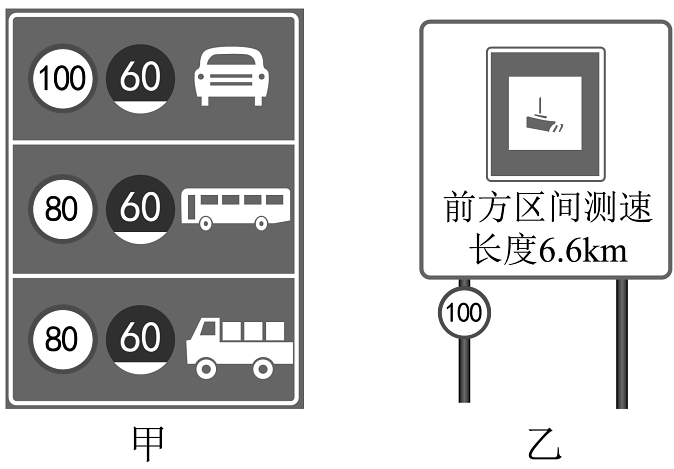 8、为兼顾行车安全与通行效率,高速公路上设置了许多限速标志,并采用定点测速、区间测速的方式确保通行。下列说法正确的是( )A、定点测速测的是速率 B、图甲表示在此路段所有车辆的速率应在到之间 C、图乙表示在这内平均速度应不大于 D、图乙表示区间测速的位移为