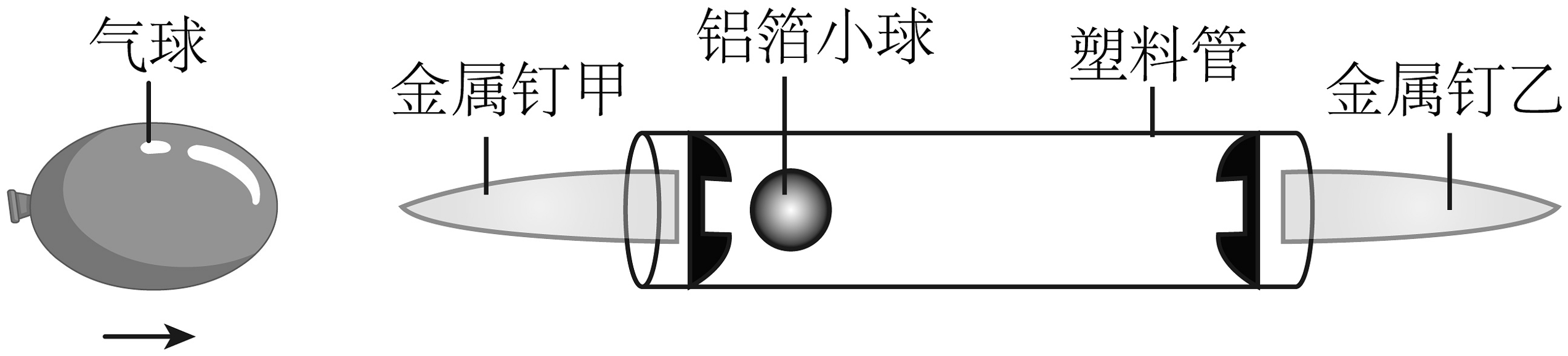 13、“富兰克林铃”可以简化成如图所示的模型,当与毛皮摩擦过的气球靠近金属钉甲时,铝箔小球就会在塑料管内“左右横跳”。下列关于“富兰克林铃”的说法中正确的是( )A、与毛皮摩擦过的气球带正电 B、气球靠近金属钉甲时,金属钉甲左侧感应出电荷,右侧带等量的异种电荷 C、气球靠近金属钉甲时,金属钉甲吸引铝箔小球,说明电荷可以创生 D、铝箔小球会在塑料管内“左右横跳”,说明能量可以创生
