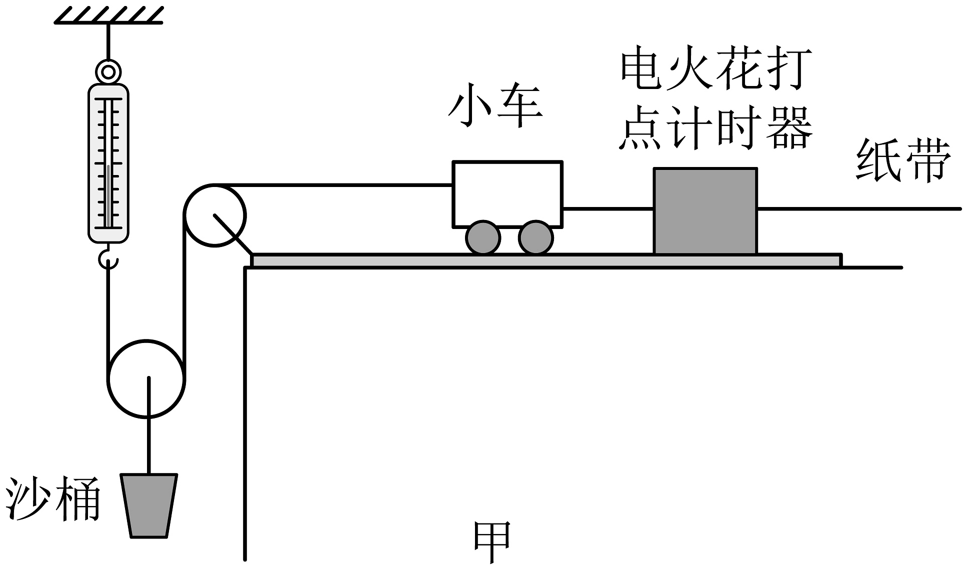 14、小明同学设计了“探究加速度与力、质量的关系”实验方案,如图甲。小车后面固定一条纸带,穿过电火花打点计时器,细线一端连着小车,另一端通过定滑轮与竖直悬挂的弹测力计相连,动滑轮下端悬挂一个装有细沙的沙桶,不计滑轮和细线的质量以及滑轮与细线间的摩擦阻力。(1)、对本实验的操作,下列说法中正确的是______。A、实验中不需要测量沙和沙桶的质量m B、实验中需要调节定滑轮的高度,使细线与长木板平行 C、实验中为减小误差,一定要保证沙和沙桶的质量m远小于小车的质量M D、平衡摩擦力时,先悬挂沙桶,再调整长木板的倾角使小车拖着纸带沿长木板匀速下滑(2)、实验过程中,打出了一条纸带,如图乙所示。打点计时器使用50Hz交流电源,纸带上标注的0、1、2、3、4、5、6为计数点,相邻两计数点间还有4个点未画出。测出。则沙桶下落的加速度。(结果保留3位有效数字)(3)、实验中,若平衡摩擦力时木板倾角过高,用F表示弹簧测力计的示数,M表示小车质量,则小车加速度a与F及的关系图像正确的是( )A、