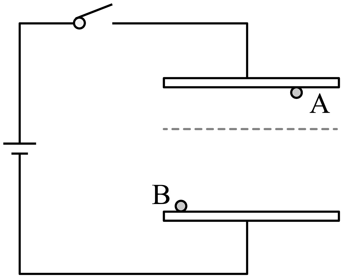 8、如图,金属板平行放置,两极接上恒定电压。质量相等的粒子A和B分别静止在上下极板处。闭合开关,两粒子仅在电场力作用下同时运动,且同时经过图中的虚线处,虚线到上下极板的距离之比为1:2,忽略粒子间的相互作用。下列说法正确的是( )A、A带负电,B带正电 B、两粒子所带电荷量大小之比为1:2 C、从开始运动到经过虚线处电场力做功之比1:4 D、减小两板间距,两粒子运动到另一极板时的速率也会减小