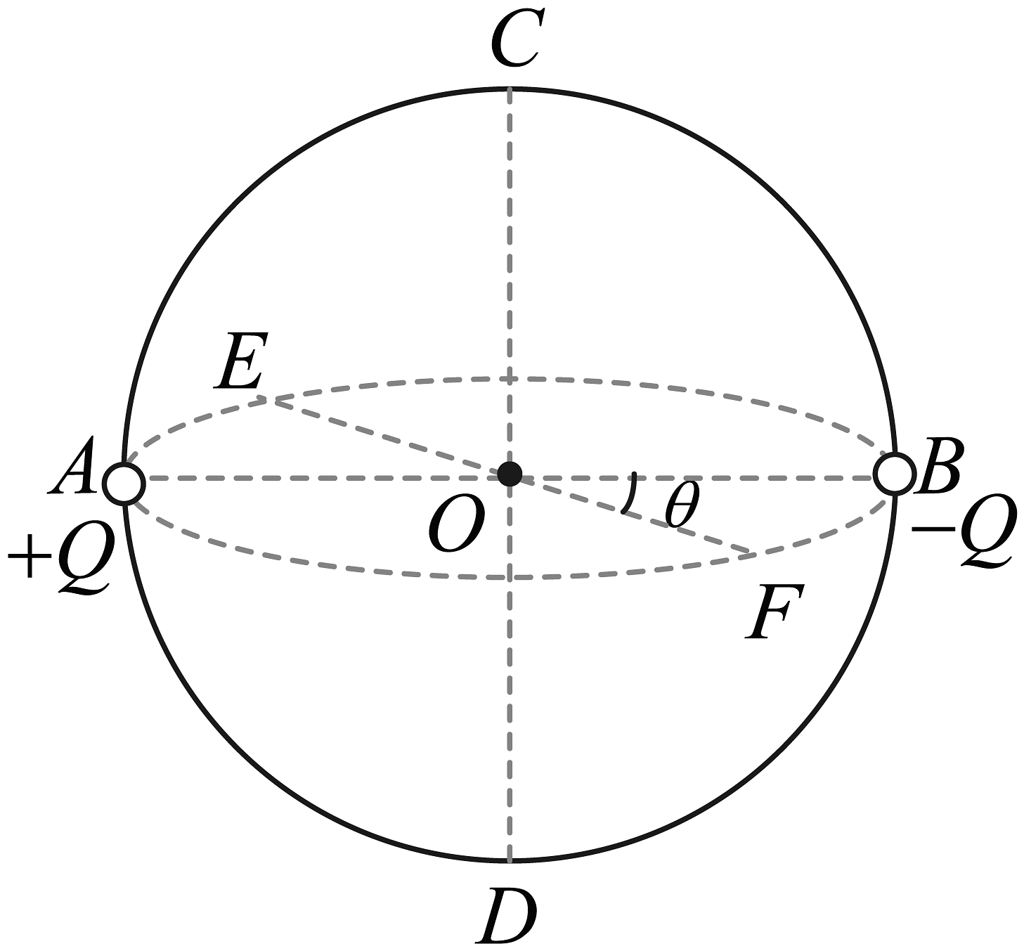 13、如图所示,AB、CD、EF都为半径为R的空间球面的直径,其中AB与EF同在水平面内,EF与AB的夹角 , CD与水平面垂直,现将电荷量大小均为Q的正、负点电荷分别固定在A、B两点,已知无穷远电势为零,静电引力常量为k,则( )A、E点电势低于C点 B、E、F两点电场强度大小均为 , 方向相同 C、将带负电的检验电荷从E点沿直线移到F点,电势能增加 D、将带负电的检验电荷从C点沿直线匀速移到D点,电场力功率先增大后减小