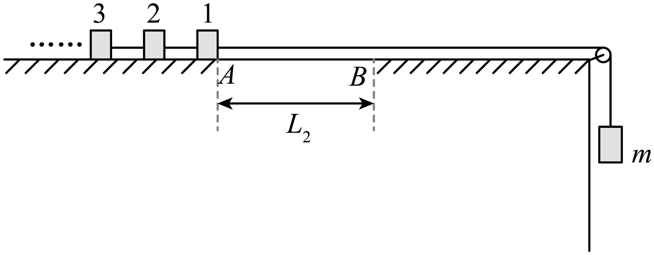 11、如图,有10个可视为质点的相同滑块质量均为 , 其中9个滑块在水平地面上分别用长的轻杆连成一条线。水平地面除一段长的粗糙区域AB外,其余各段均光滑。现用水平轻绳一端连接滑块1,另一端跨过光滑定滑轮连接第10个滑块。释放系统时,滑块1从A处由静止开始运动。设在整个运动过程中悬挂滑块未到达地面,B点到滑轮距离足够长,滑块与粗糙区域间的动摩擦因数 , 重力加速度g取。求: