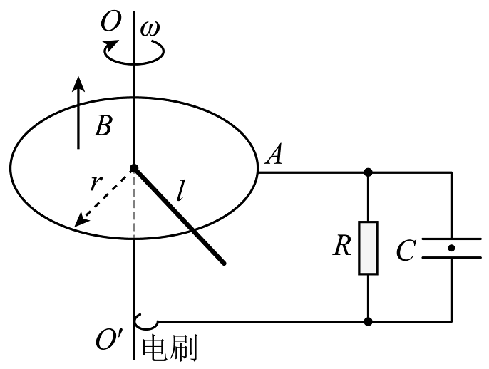 4、如图所示,固定在水平面上的半径为r的金属圆环内存在方向竖直向上、磁感应强度大小为B的匀强磁场。长为l的水平金属棒,一端固定在竖直导电转轴OO'上,随轴以角速度ω匀速转动,转动时棒与圆环接触良好,在圆环的A点和电刷间接有阻值为R的电阻和电容为C、板间距为d的平行板电容器,有一带电微粒在电容器极板间处于静止状态。已知重力加速度为g,不计其他电阻和摩擦,下列说法正确的是( )A、棒产生的电动势为 B、微粒的电荷量与质量之比为 C、电阻消耗的电功率为 D、电容器所带的电荷量为