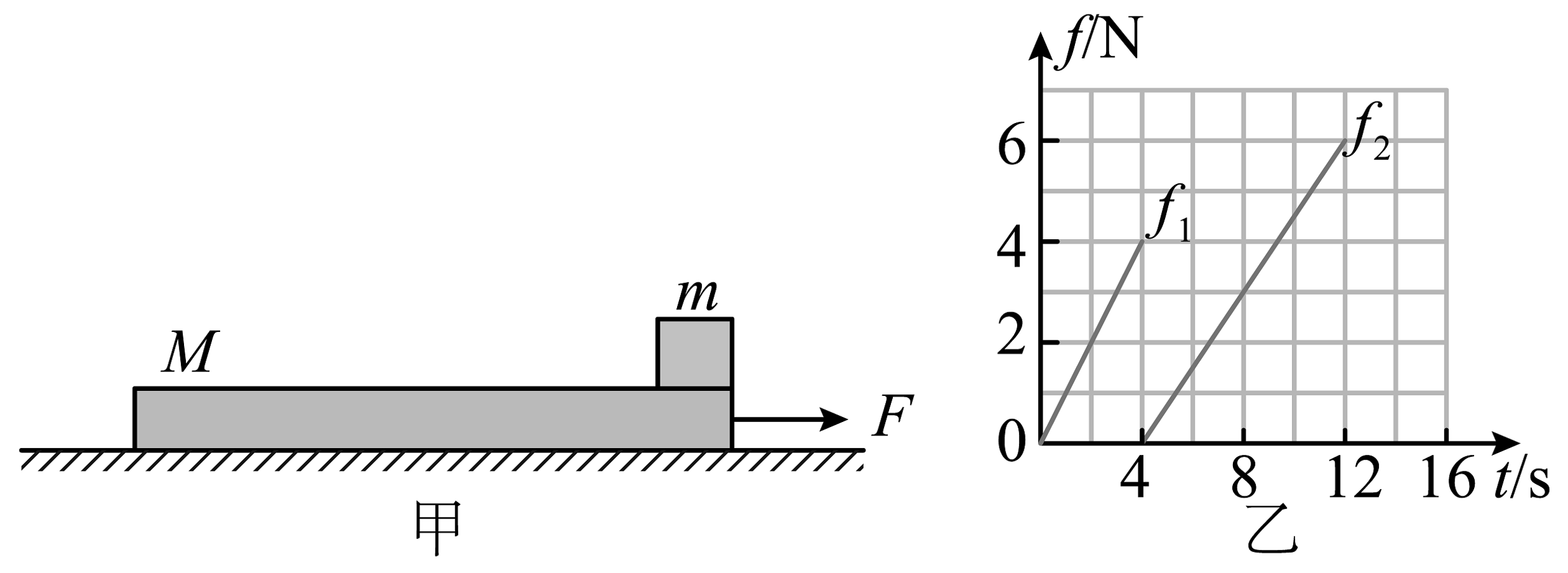 10、如图甲所示,粗糙水平面上:静置一质量M = 1kg的长木板,其上叠放一质量为m的木块。现给木板施加一随时间t均匀增大的水平力F = kt(k = 1N/s)。已知木板与地面间的摩擦力为f1 , 木块与木板之间的摩擦力为f2 , f1和f2随时间t的变化图线如图乙所示。若最大静摩擦力均与相应的滑动摩擦力相等,重力加速度g = 10m/s2。下列说法正确的是( )A、木块的质量m = 3kg B、木板与地面间的动摩擦因数为0.1 C、木块与木板间的动摩擦因数为0.3 D、16s末木块与木板的速度大小之比为2:3