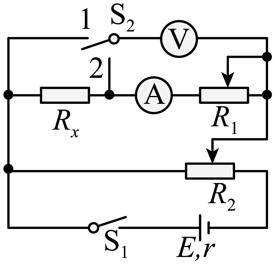 (2)为了减小测电阻的系统误差,该小组设计了如图所示的电路图。实验操作步骤如下:先将R2的滑动触头滑到(填“最左端”或“最右端”),连接电路,再将单刀双掷开关向“1”闭合,调节滑动变阻器R1、R2 , 使电压表或电流表示数(填“尽量大些”或“尽量小些”),读出此时电压表和电流表示数U1、I1 , 然后保持两滑动变阻器的滑动触头位置不变,将单刀双掷开关向“2”闭合,读出此时电压表和电流表示数U2、I2、,则被测电阻的表达式Rx=(用U1、I1、U2、I2表示)。